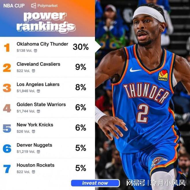 今日,美国预测平台《PolyMarket》根据数据大模型公布了本届NBA杯(原季中赛)夺冠概率榜单,结果显示雷霆以绝对的优势排在榜首,湖人排在了第三,具体排名为:1、雷霆30%,2、骑士9%,3、湖人8%,4、勇士6%,5、尼克斯6%,6、掘金5%,7、火箭5%。截至目前,湖人在NBA杯中取得了1胜0负的战绩,以净胜分的优势(+5净胜分,高于第二快船的+2)排在西部B组第一名。